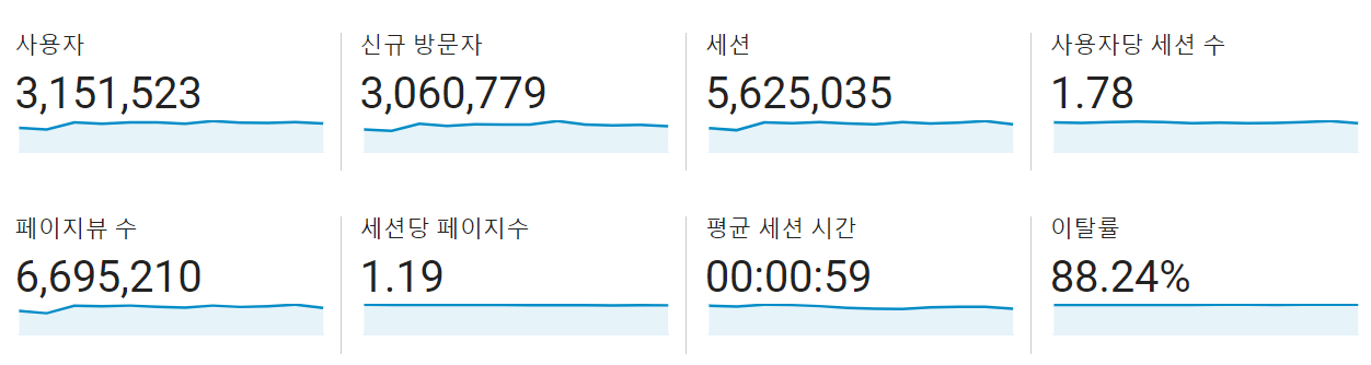 작년 한 해에는 300만 명이 넘는 분들이 제 블로그를 방문해주셨고 페이지뷰는 669만을 기록하였습니다. 사용자와 세션은 작년에 비해 절대적인 수치는 약 10만 명 정도 소폭 늘었지만 페이지뷰 수는 무려 150만 뷰 정도가 감소하였는데요. 이는 제 블로그의 글을 하나만 보고 이탈한 사람의 숫자가 많다는 뜻이며 그만큼 제 블로그에 매력이 떨어지고 있다고 해석할 수 있는 지표입니다. 조금 더 분발해야겠습니다.