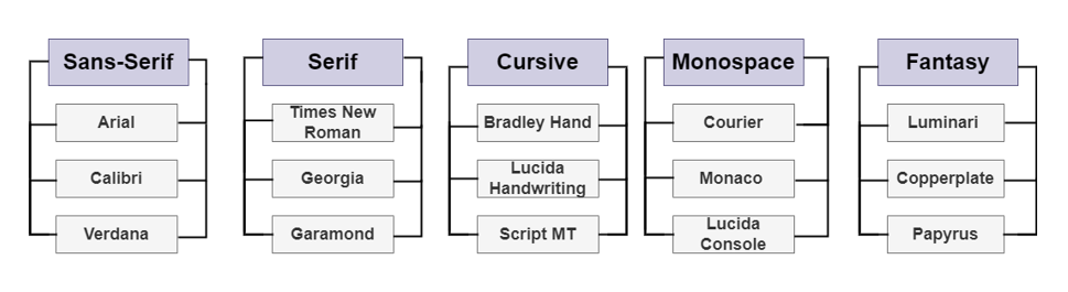 위와 같이 generic family안에 font family가 속해있는 자식-부모 관계로 되어있으며 자식에 해당하는 글꼴이 없는 경우에는 부모인 generic family 글꼴로 대체됩니다.
