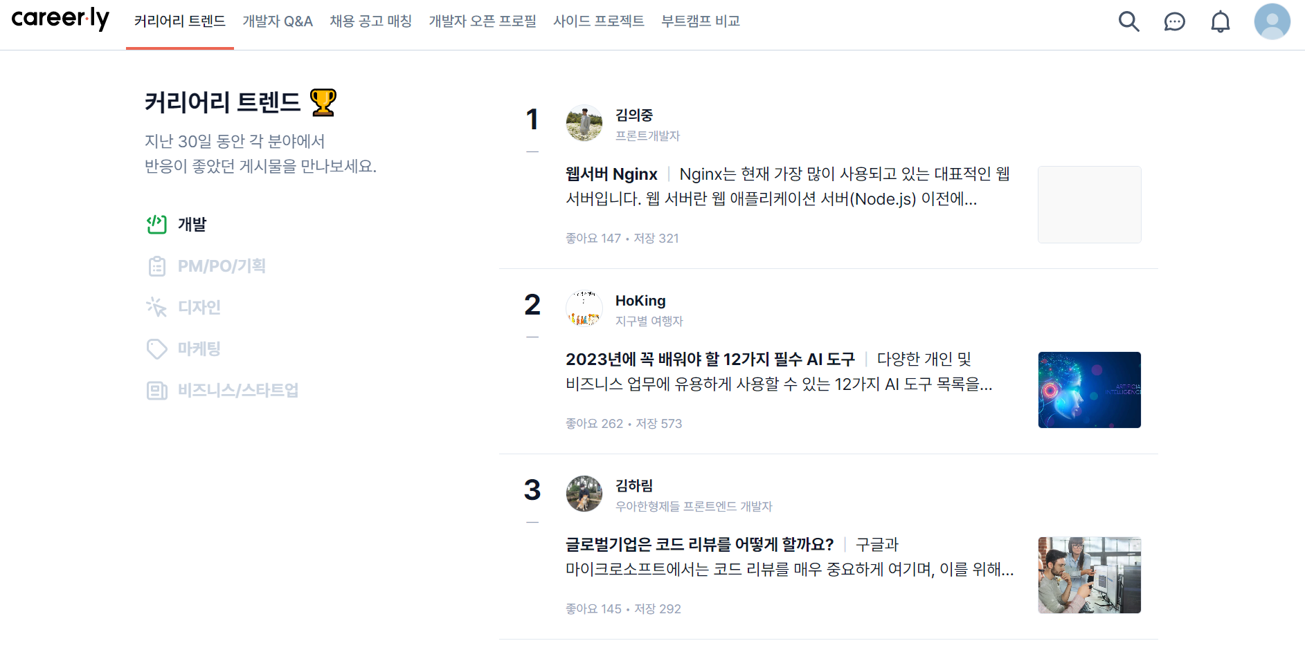 커리어리 트렌드는 한 달 동안 좋아요, 방문자 등 반응이 좋았던 게시물들을 모아둔 메뉴입니다. 아무래도 사람들의 관심을 많이 받은 게시글이다 보니 흥미로운 내용의 글들이 많아 저는 주로 이곳에서 인사이트를 얻게 되더라고요.