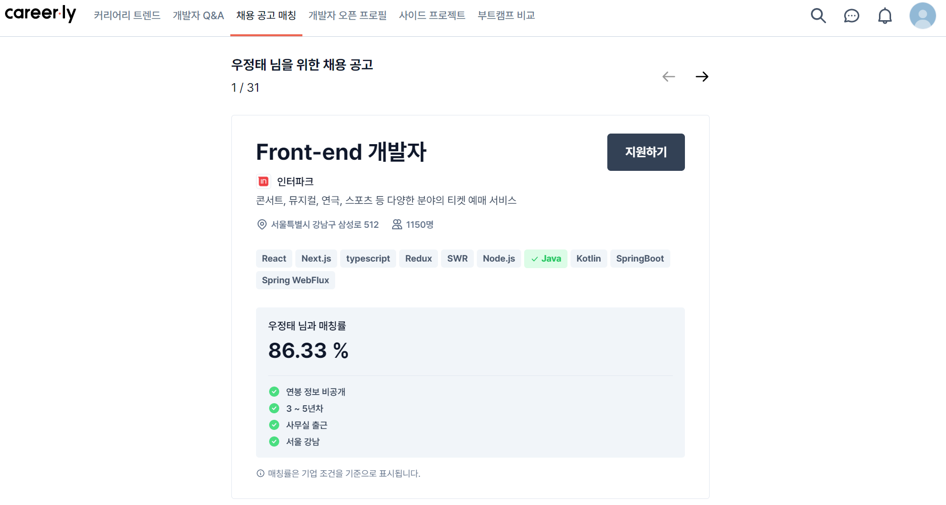 자신이 가지고 있는 기술 스택과 경력, 채용 포지션 등을 설정하면 현재 나에게 적합한 채용공고들을 전부 보여줍니다. 마음에 드는 채용 공고가 있다면 우측 상단의 지원하기 버튼을 눌러보세요. 그러면 지금 채용을 하고 있는 사이트로 이동할 수 있습니다. 조금 더 좋은 조건으로 이직을 원하는 IT 직군 현직자들에게 굉장히 유용하게 사용할 수 있는 메뉴라고 생각됩니다.