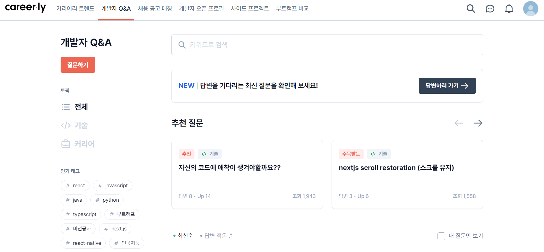 개발자 Q&A는 말 그대로 개발자들이 궁금한 사항이 생겼을 때 다른 개발자들에게 질문을 하고 답변을 받는 메뉴입니다. 한국의 스택오버플로우라고 생각하시면 이해가 빠르실 듯합니다.
