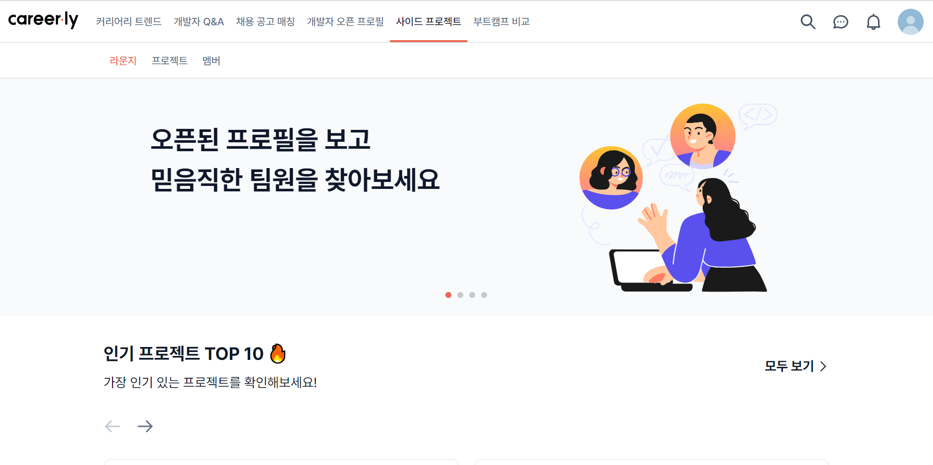 개발자는 실전경험이 중요합니다. 업무 외적으로도 사이드 프로젝트를 함께 병행하면 좋은데요. 본인이 아이디어가 없다면 남들이 진행하고 있는 프로젝트에 같이 참여해서 나의 실력도 높이고 포트폴리오도 만들어보는 것도 좋을 것 같습니다. 반대로 아이디어는 있는데 해야 할 일이 너무 많다면 이곳에서 함께 프로젝트를 진행할 믿음직한 팀원도 찾을 수 있습니다.