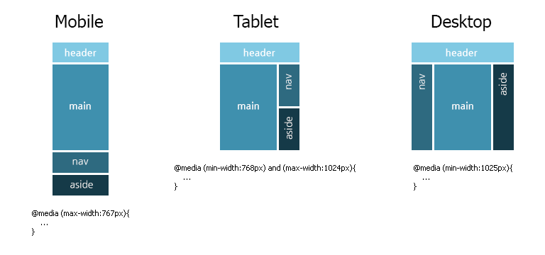 최근에는 웹 사이트의 접속 디바이스가 모바일이 가장 많기도 하고 화면이 작은 모바일에서 제약 조건이 더 많기 때문에 모바일 UI를 우선시하고 점차 크기를 키워나가면서 UI를 구성합니다. 이렇게 모바일 화면을 우선으로 생각하여 min-width, 좁은 해상도부터 시작하는 것을 모바일 퍼스트(mobile first)라고 하며 반대로 컴퓨터 화면을 우선으로 생각할 때 max-width, 넓은 해상도부터 시작하는 것을 데스크톱 퍼스트(desktop first)라고 합니다.