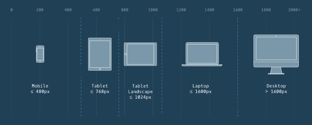 미디어 쿼리를 작성할 때 서로 다른 CSS를 적용할 화면의 크기를 중단점(breakpoints)이라고 합니다. 위의 예제에서는 800 초과, 569px, 381px, 380 이하로 중단점을 설정하였습니다. 제 블로그에서 가장 직관적으로 확인할 수 있는 크기라고 생각했기 때문입니다. 중단점이 세분화되어 있을수록 좋으나 시중의 모든 기기들을 반영하기에는 무리가 따르기 때문에 최소한 모바일, 태블릿, PC 이렇게 3가지로 구분해서 처리를 하는 경우가 많습니다. 각 디바이스의 스크린 표준 사이즈는 아래 이미지를 참고해주세요.