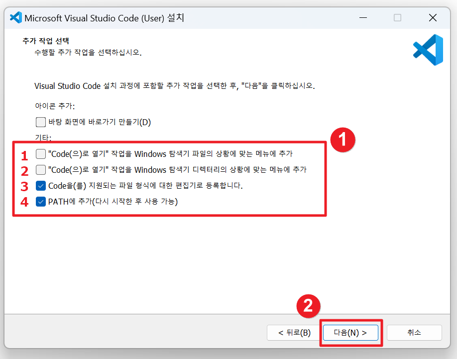 6. 필요한 추가 작업을 선택합니다. 각 추가작업의 설정은 아래와 같습니다. 기본으로 설정되어 있는 3번 4번은 체크하고 다음버튼을 클릭하는 것을 추천드립니다.