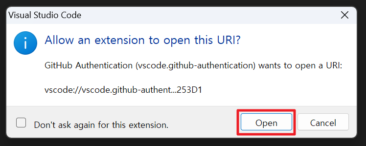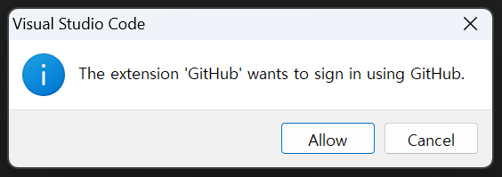 3. 비주얼 스튜디오 코드의 Github 확장프로그램에서 Github 로그인을 하려고 한다는 팝업창이 뜹니다. allow를 클릭합니다.