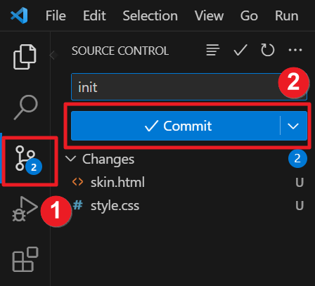 11. 이제 깃 레파지토리에 소스를 업로드해야 합니다. 소스코드 수정을 완료하였다면 좌측 3번째 아이콘을 클릭합니다. 그럼 Changes에 변경된 사항이 보일겁니다. 상단에 입력창에 메시지를 입력하고 Commit 버튼을 클릭합니다.