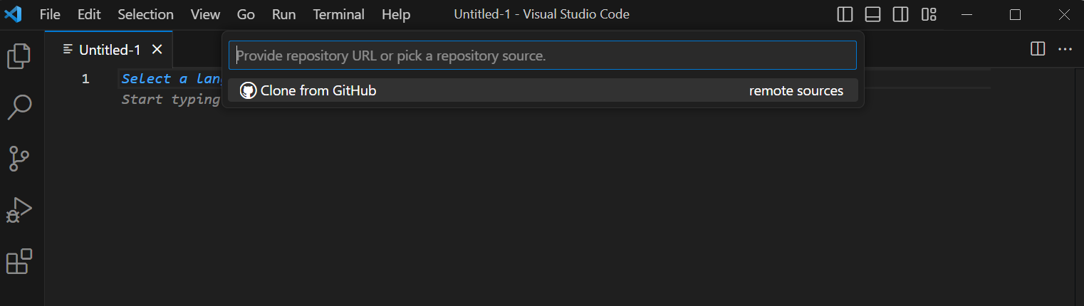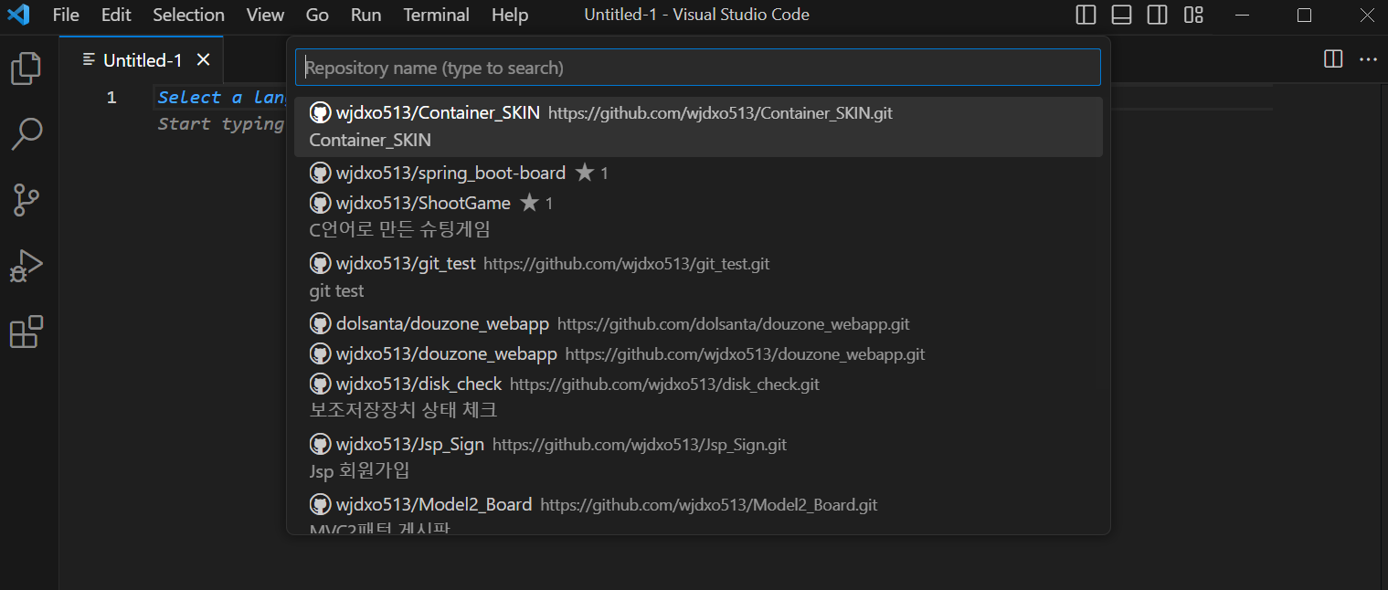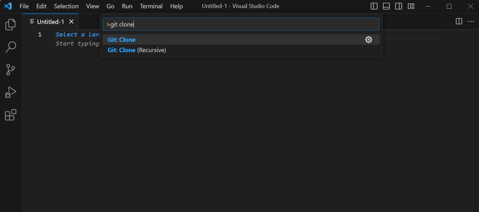 1. 키보드 [F1]을 눌러 명령어창을 켠 뒤 git clone을 입력하여 실행합니다. 여기서 git clone를 입력했는데 no matching commands라고 뜬다면 깃허브 설치가 안되어 있는 것이기에 깃허브를 먼저 설치해주셔야 합니다. 깃허브는 아래 링크에서 설치가 가능합니다. 깃허브 설치 후 VS Code를 재실행해주세요.