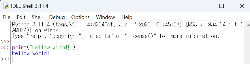 3. 파이썬 IDLE에서 print("Hellow World!")라는 명령어를 입력해 보세요. 위와 같이 문자열이 출력된다면 파이썬이 잘 동작하고 있다는 것입니다.