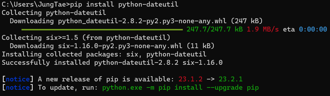 파이썬 dateutil이 설치가 되어 있지 않아 위의 예제가 실행되지 않는 분들도 있을 것입니다. cmd 창을 켜신 뒤 명령어 pip install python-dateutil 이라는 명령어를 입력해 주시면 python-dateutil을 설치할 수 있으니 이 라이브러리를 다운로드하고 다시 예제 코드를 실행시켜 주시기 바랍니다.