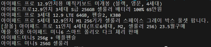 간단한 예시로 클리앙이라는 사이트의 중고장터에서 데이터를 크롤링하여 아이패드 관련 제목을 출력하는 소스코드를 짜보았습니다. 아래에 소스코드 구문 분석을 통해 위의 소스코드를 자세히 설명할 테니 참고하셔서 여러분들이 데이터를 가지고 와야 할 사이트를 크롤링해 보시기 바랍니다.