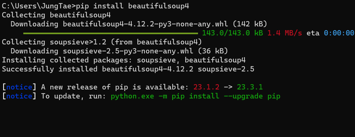 라이브러리 다운로드(requests, beautifulsoup)