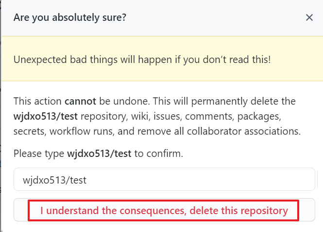 5. 그런 뒤 확인작업을 두 번 거쳐야 하는데요. 제거할 레파지토리명과 계정 패스워드를 차례로 입력해주면 레파지토리 삭제가 완료됩니다.